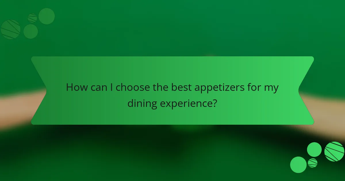 To choose the best appetizers for your dining experience, consider the flavor profiles and your main dish. Appetizers should complement the meal without overpowering it. For example, if your main course is rich, opt for lighter appetizers. Variety is important; include options like dips, sliders, or skewers. Pay attention to dietary restrictions of your guests. A balanced selection can cater to different tastes. Seasonal ingredients often enhance flavor and freshness. Research shows that diverse appetizers improve overall dining satisfaction. Aim for a mix of textures and flavors to create an enjoyable start to your meal.