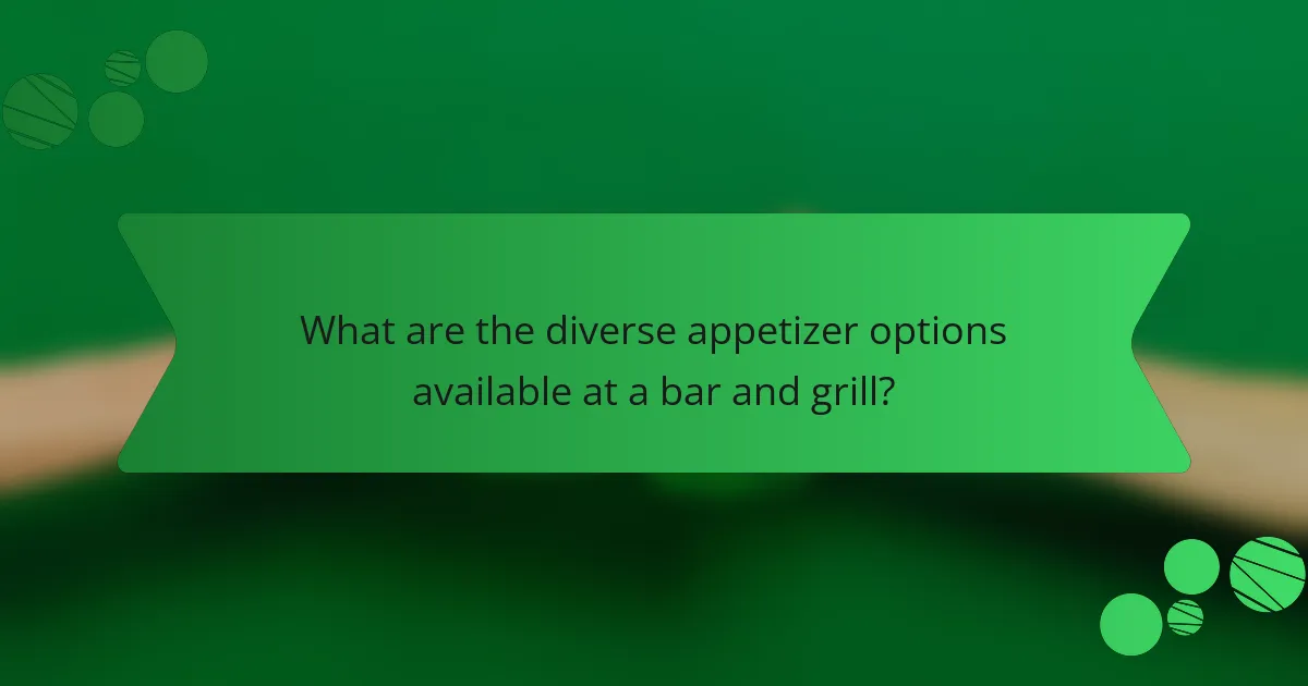 The main entity of this article is diverse appetizer options at bar and grill establishments. It provides an overview of various appetizers, including buffalo wings, mozzarella sticks, and seafood selections, while detailing their unique flavor profiles influenced by regional cuisines. The article discusses typical serving sizes, catering to both shareable and individual preferences, and offers pairing suggestions that enhance the overall dining experience. Additionally, it highlights emerging trends in appetizer choices, including health-conscious options and innovative cooking techniques, ensuring a comprehensive understanding of the topic.