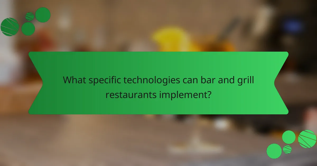 Bar and grill restaurants can effectively implement technology by integrating point-of-sale (POS) systems, online ordering platforms, and customer relationship management (CRM) tools. POS systems streamline transactions and inventory management, enhancing operational efficiency. Online ordering platforms allow customers to place orders remotely, increasing sales opportunities. CRM tools help restaurants personalize customer interactions and track preferences, leading to improved satisfaction.
