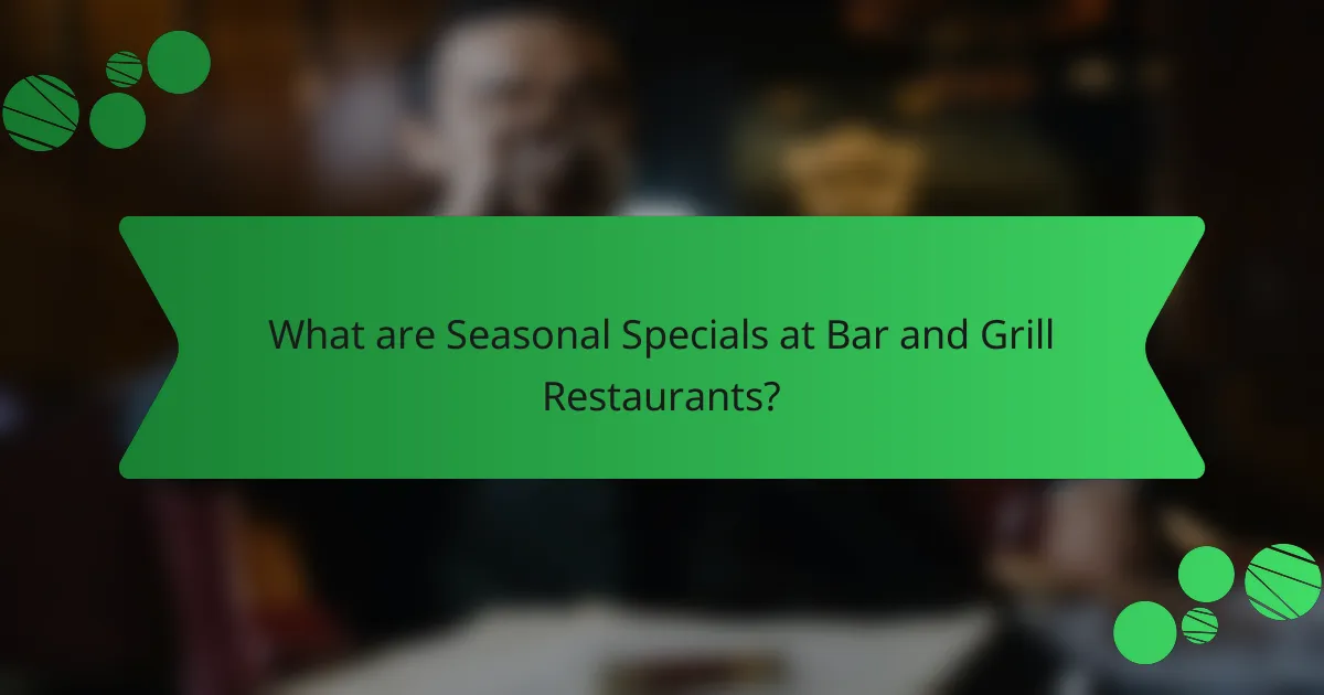 Seasonal specials at bar and grill restaurants are unique menu offerings that change according to the seasons, utilizing fresh, locally sourced ingredients. These specials highlight the flavors characteristic of each season, such as summer tomatoes, autumn pumpkins, and winter greens, while also incorporating themes related to holidays and local events. Limited-time offers, such as pumpkin spice dishes in fall or summer barbecue platters, create urgency and excitement, encouraging customers to explore new culinary experiences. Overall, seasonal specials enhance the dining experience by providing variety and showcasing culinary creativity through the use of seasonal ingredients and themes.