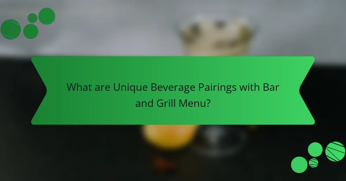 Unique beverage pairings with a bar and grill menu include craft beers, cocktails, and specialty sodas. Craft beers complement grilled meats well, enhancing flavors. For instance, a hoppy IPA pairs nicely with spicy wings. Cocktails like a smoky margarita can enhance the taste of grilled shrimp. Specialty sodas, such as ginger beer, offer a refreshing contrast to rich barbecue dishes. Each beverage choice enhances the dining experience. These pairings are based on flavor profiles that balance or complement the food served.